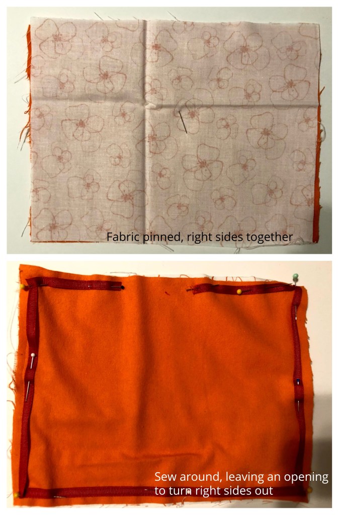 - Place the two rectangles of fabric right sides together and sew around the edge using a ⅛ or 1/16 inch seam allowance. Leave a gap 1 inch to 1.5 inches wide in one of the longer sides of the rectangle so you can turn the fabrics right sides out.