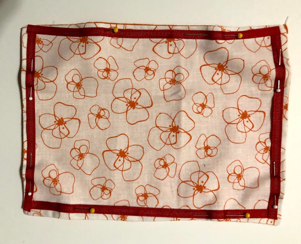 11. Place the 6.5 inch elastics on the corners of the mask and pin in place, then sew all the way along the sides again to flatten and hold the elastics in place