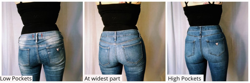 If that doesn’t make the jeans do what you want them to do for your body, the next thing I suggest is taking note of where the pockets hit you on the jeans. My general rule for this is that the side corners of the pocket hit the width that you want people to notice. Jeans that fit properly should have pockets whose bottom corners hit the widest part of your butt. Lower pockets will make your butt look smaller, while higher pocket give a lifted, rounded effect.