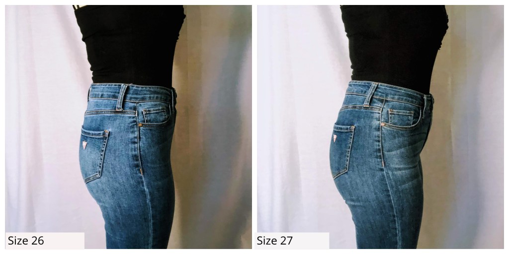 My first suggestion is to try on the next size up. I know there’s a little bit of stigma in sizing up, but trust me. Size is just a number and nobody will know what size you’re wearing except you. The only thing a person will know is whether they like how you look in the jeans or not. I call this trick buying for wiggle room. If your butt can move, it will look better than if it’s squished- however by sizing up you lose out on tummy control in the front.