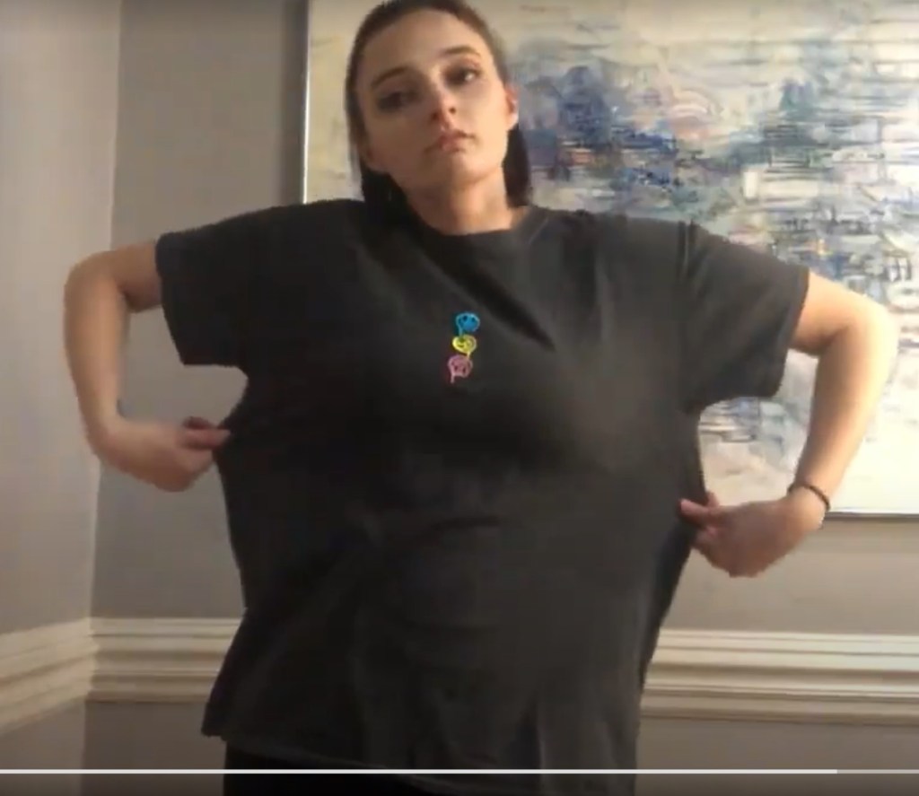 From there, we’re going to move on to the waist of the tee. This isn’t so much about fit as it is about what vibe you want to give. If you want a relaxed vibe, you might not even need to worry about this step- a relaxed look can be accomplished just through manipulating the hem and the lower side seams, depending on how big the t-shirt was on you to begin with.. But if you want a little more of a “J.Lo just leaving her spin class but somehow still looking amazing and not even tired” snatched waist look, just pinch in the tee at your natural waist (about an inch to two inches above your belly button, or the thinnest part of your torso) and pin to taper it in- just make sure that when you have it pinned, the tee isn’t stretching flat or pulling against you for that weekender, effortless vibe- it should still hang slightly loose and not skin tight.