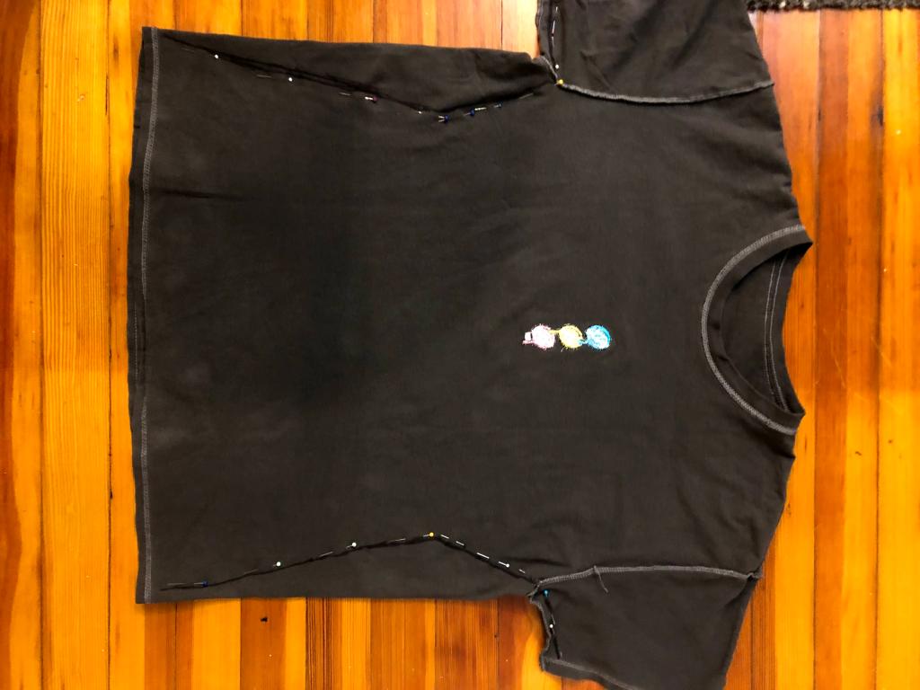 Put the shirt on inside out for this part, since you’ll be sewing it, you want the seams to be on the inside of the shirt.